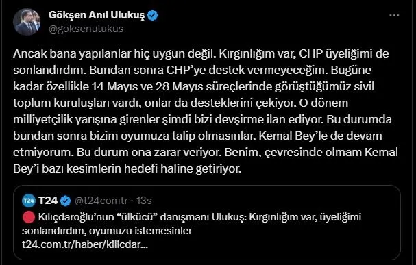 Ulukuş, "O zaman bundan sonra seçimde oyumuzu da istemesinler. CHP, kariyer yapılan bir yer haline dönüşmüş. Ben Kemal Bey'le çalıştığım süre içerisinde hiçbir ticari işe bulaşmadım, hiçbir yakınım için de buna müsaade etmedim. Ancak bana yapılanlar hiç uygun değil. Kırgınlığım var, CHP üyeliğimi de sonlandırdım. Bundan sonra CHP'ye destek vermeyeceğim. Bugüne kadar özellikle 14 Mayıs ve 28 Mayıs süreçlerinde görüştüğümüz sivil toplum kuruluşları vardı, onlar da desteklerini çekiyor. O dönem milliyetçilik yarışına girenler şimdi bizi devşirme ilan ediyor. Bu durumda bundan sonra bizim oyumuza talip olmasınlar. Kemal Bey'le de devam etmiyorum. Bu durum ona zarar veriyor. Benim, çevresinde olmam Kemal Bey'i bazı kesimlerin hedefi haline getiriyor." dedi.