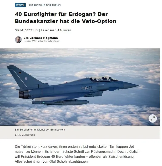 Başkan Erdoğan'ın Almanya'ya Eurofighter restini duymazdan gelmeye çalışan die Welt ise "Erdoğan'a 40 Eurofighter mı? Şansölyenin veto seçeneği var" başlığını kullandı. İkinci one minute çıkışına rağmen Türkyie'yi Eurofighter konusunda tehdit etmeye çalışan die Welt, "Türkiye, kendi geliştirdiği ilk hayalet jetini kullanmak üzere. Silahlanma gücüne doğru bir sonraki adımdır. Ancak Cumhurbaşkanı Erdoğan görünüşe bakılırsa geçici bir çözüm olarak birdenbire 40 Eurofighter satın almak istedi. Artık her şey Olaf Scholz'a bağlı görünüyor." ifadelerini kullandı.