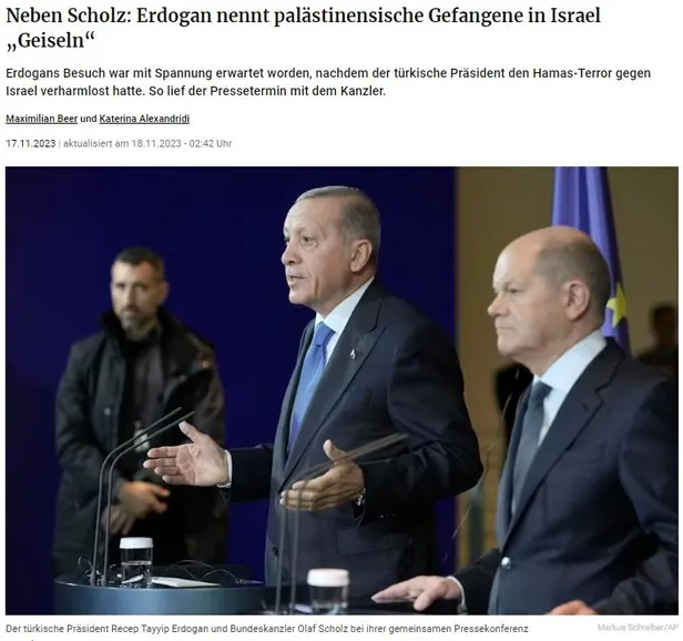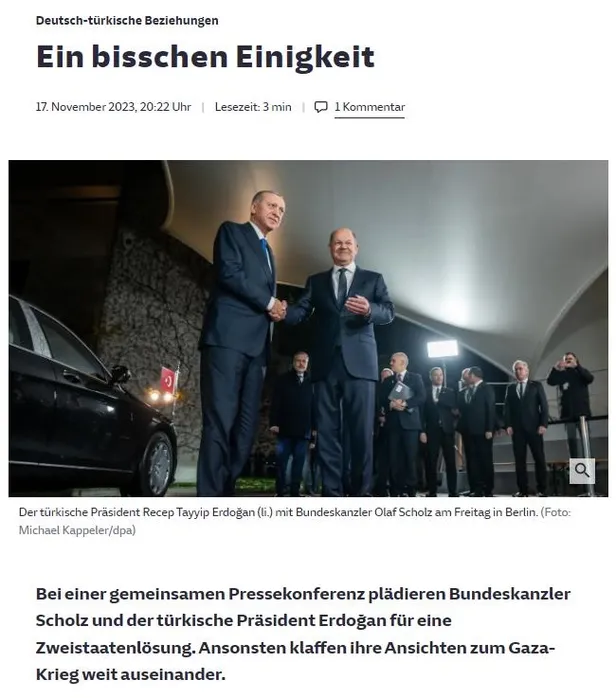 Süddeutsche Zeitung ise "Başbakan Scholz ve Türkiye Cumhurbaşkanı Erdoğan ortak basın toplantısında iki devletli çözümü savunuyor. Aksi takdirde Gazze savaşına ilişkin görüşleri büyük ölçüde farklılık gösteriyor." ifadelerini kullanarak Alman Başbakan Olaf Scholz'ün İsrail'e desteğini vurguladı.