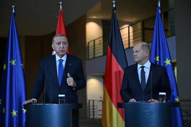 Erdoğan, Almanya Başbakanı Olaf Scholz ile baş başa görüşme ve heyetler arası çalışma yemeği öncesinde ortak basın toplantısı düzenledi.