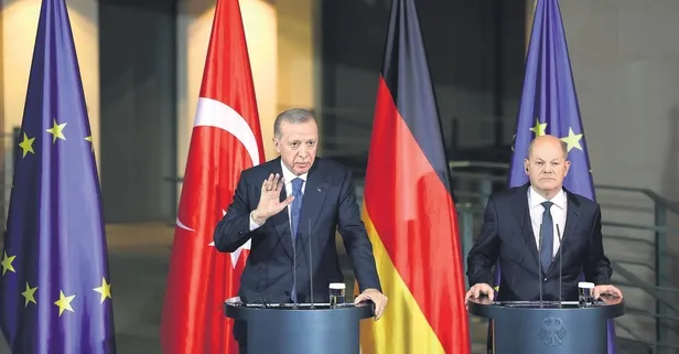 Başkan Erdoğan, Berlin'de Almanya Başbakanı Olaf Scholz ile bir araya geldi. Erdoğan, "İsrail'in kendisini savunma hakkı vardır" diyen Scholz'a net cevap verdi: