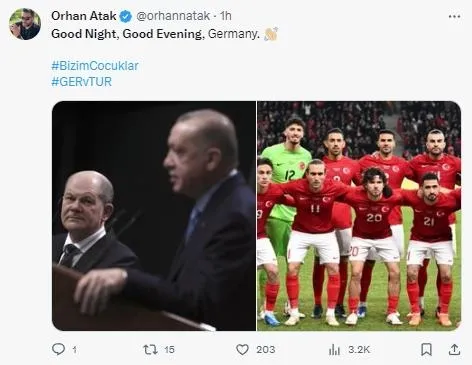 "Dün masada bügün sahada.! Tebrikler Milli gururumuz. Good evening, good night Almanya-Türkiye"