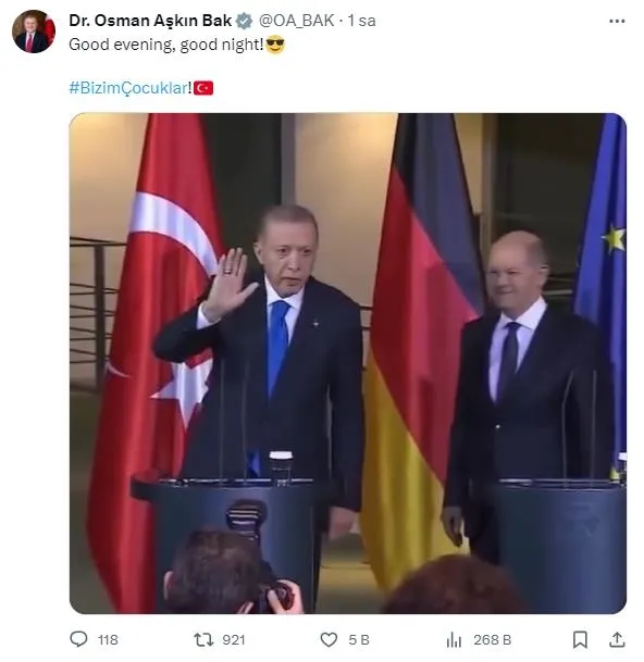 Gençlik ve Spor Bakanı Dr. Osman Aşkın Bak, "Good evening, good night!" notunu düştü.