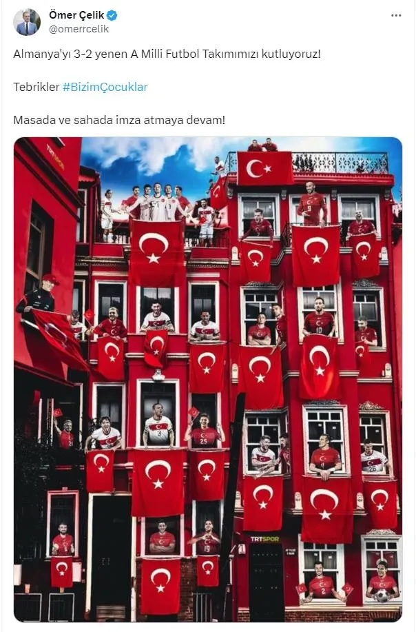 AK Parti Sözcüsü Ömer Çelik sosyal medya hesabından, "Almanya'yı 3-2 yenen A Milli Futbol Takımımızı kutluyoruz!" Tebrikler #Bizimçocuklar. Masada ve sahada imza atmaya devam!" ifadelerini kullandı.