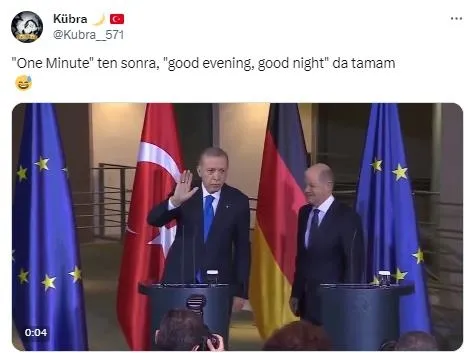Gazetecilerin soruları bittikten sonra kulaklığını çıkaran Erdoğan, toplantı sonunda "Good evening, good night" diyerek veda etmişti.