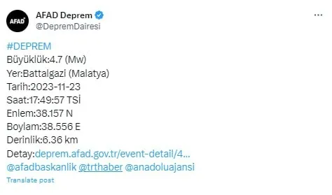 Battalgazi'deki ilk depremin ardından saat 17.49'da 4,7 büyüklüğünde ikinci bir deprem meydana geldi. Depremin, 6,36 kilometre derinlikte olduğu belirlendi.