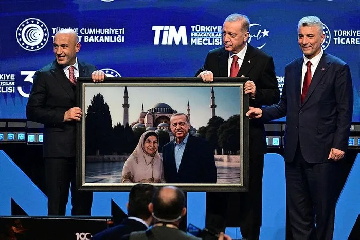 Törende TİM Başkanı Gültepe, Başkan Erdoğan'a annesi Tenzile Erdoğan'la birlikte yapay zekayla Ayasofya Camisi'nin önünde resmedildiği tabloyu hediye etti.