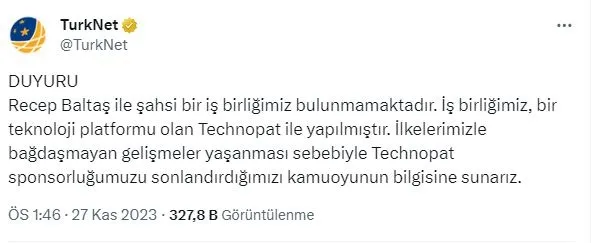 Türknet 'ten yapılan açıklamada Baltaş ile bir iş birlklerinin bulunmadığını belirterek, "İş birliğimiz, bir teknoloji platformu olan Technopat ile yapılmıştır. İlkelerimizle bağdaşmayan gelişmeler yaşanması sebebiyle Technopat sponsorluğumuzu sonlandırdığımızı kamuoyunun bilgisine sunarız." ifadelerine yer verildi.