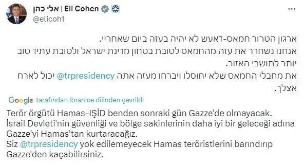 Dışişleri Bakanlığı Sözcüsü Keçeli, İsrail Dışişleri Bakanı Eli Cohen'in sosyal medyada yaptığı paylaşıma ilişkin, "İşgalci bir gücün, sivil nüfusa yönelik hunharca saldırıları hiçbir şekilde meşru müdafaa olarak kabul edilemez." ifadelerini kullandı.