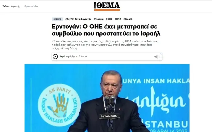 Yunan Proto Thema 'Erdoğan: BM, İsrail'i koruyan bir konseye dönüştü' başlıklı haberinde şu ifadeye yer verdi;