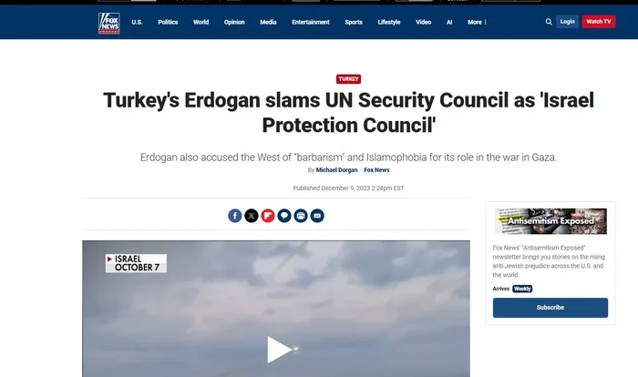 Fox News 'Erdoğan, BM Güvenlik Konseyi'ni 'İsrail Koruma Konseyi' olarak eleştirdi' başlığı ile okurlarının karşısına çıktı.