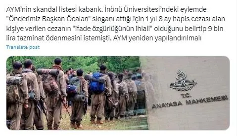 AYM, İnönü Üniversitesi'nde gerçekleştirilen eylemde "Önderimiz Başkan Öcalan" sloganları attığı için 1 yıl 8 ay hapis cezası alan kişiye verilen cezanın "ifade özgürlüğünün ihlali" olduğunu belirterek 9 bin lira tazminat ödenmesini istemişti.
