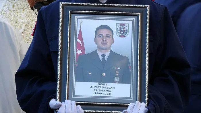 Şehit Piyade Sözleşmeli Er Aslan'ın naaşı, Garnizon Şehitliği'nde toprağa verildi. Milli Savunma Bakan Yardımcısı Şuay Alpay, baba Mehmet Aslan'a Türk bayrağı ile şehit oğlunun fotoğrafını verdi.