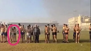 Aralarında çocukların ve yaşlıların da bulunduğu Filistinlileri alıkoyan ve yarı çıplak şekilde soyarak stadyumda teşhir eden İsrail güçlerine ait tankların namlularının da bu Filistinlilere doğru çevrili olduğu görülüyor.