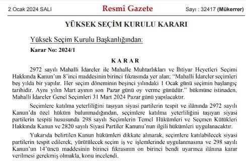Yüksek Seçim Kurulunun (YSK), 31 Mart 2024 Pazar günü yapılacak Mahalli İdareler Genel Seçimleri'ne 36 siyasi partinin katılabilme yeterliliğine ilişkin kararı Resmi Gazete'nin mükerrer sayısında yayımlandı.