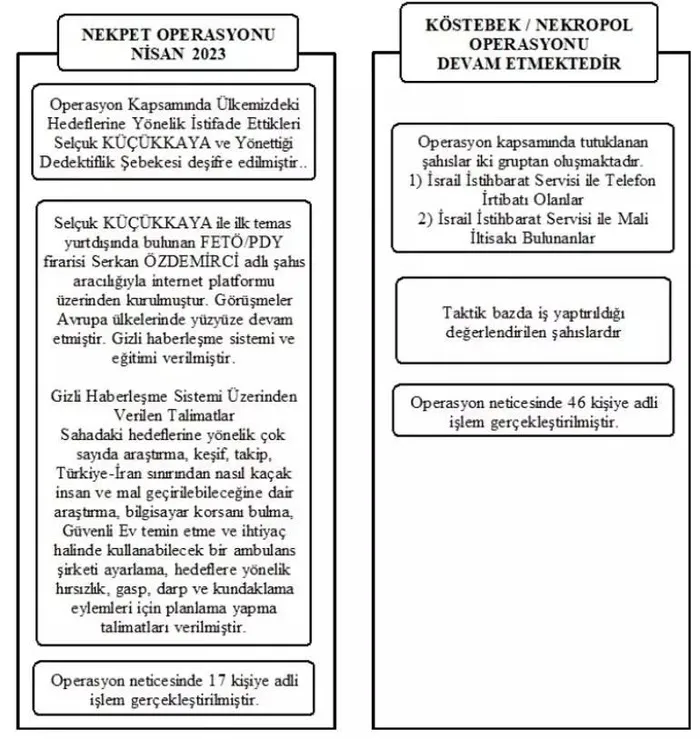 Çalışmalarda, İsrail Dış İstihbarat Servisi Mossad'ın, Türkiye'de insani mülahazalarla ikamet eden Filistinli ve İsrail'in yaptıklarına karşı olan İsrailli aktivistlere yönelik keşif, takip, darp ve adam kaçırma gibi işler yapmayı amaçladığı bilgileri tespit edildi.