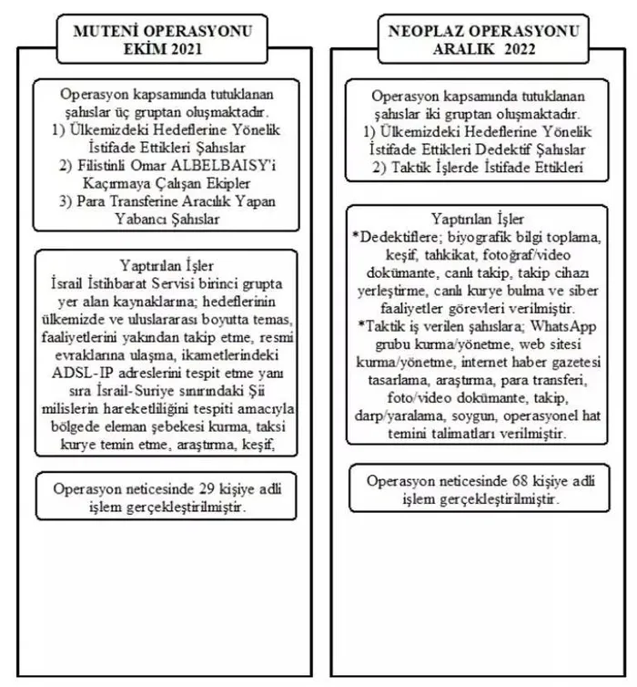İstanbul Cumhuriyet Başsavcılığınca yürütülen soruşturma kapsamında, İsrail İstihbarat Servisinin Türkiye'de ikamet eden yabancı uyruklulara yönelik keşif, takip, darp ve adam kaçırmaya yönelik amaçlarının olduğu tespit edildi.