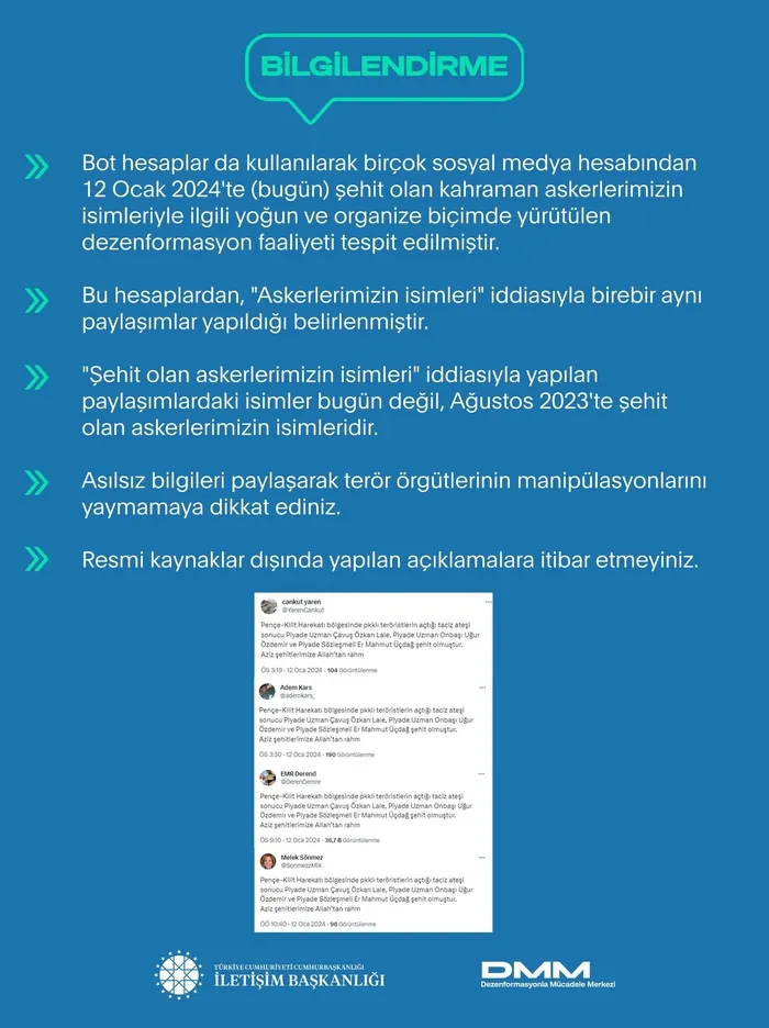 Öte yandan Cumhurbaşkanlığı İletişim Başkanlığı Dezenformasyonla Mücadele Merkezi, "Şehit olan askerlerimizin isimleri" iddiasıyla bugün yapılan paylaşımların doğru olmadığını, isimlerin Ağustos 2023'te şehit olan askerlere ait olduğunu bildirdi.