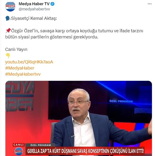 Başkan Recep Tayyip Erdoğan ve AK Parti'nin ülkeyi birleştiren tutum ve politikalarından rahatsızlık duyduğunu belirten Kemal Aktaş isimli bölücü "Özgür Özel'in değerlendirmeleri, mesajları kısa da olsa vurguları önemli. Dikkat çekici" dedi, "Özgür Özel'in, savaşa karşı ortaya koyduğu tutumu ve ifade tarzını bütün siyasi partilerin göstermesi gerekiyordu" ifadelerini kullandı.