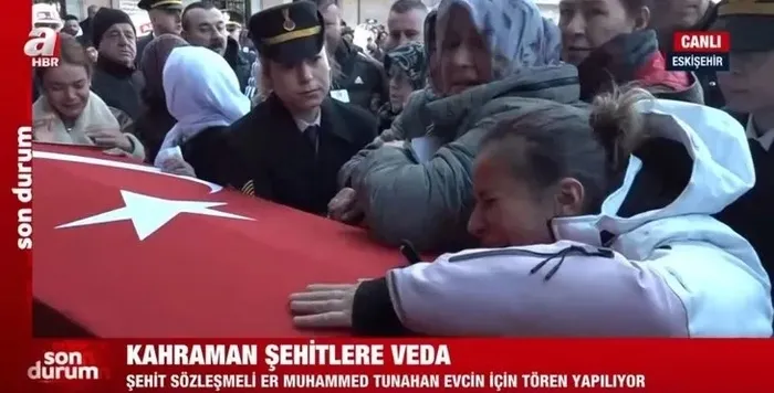 Sözleşmeli Er Muhammed Tunahan Evcin için Eskişehir'de tören var. 27 yaşındaki asker, ailenin 3 çocuğundan en küçüğüydü. Cenazede ayakta durmakta güçlü çeken Erdinç Evcin ve abla Ümmühan Evcin, kardeşlerinin tabutuna sarılarak gözyaşı döktü. Anne Ferah Evcin da oğlunun tabutuna sarılarak "Yavrum böyle mi gelecektin" diyerek ağladı.
