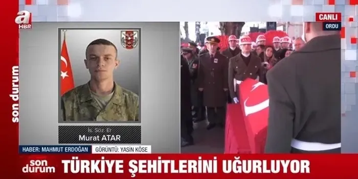 Son dakika haberleri... Irak'ın kuzeyinde yer alan Pençe Kilit operasyon bölgesinde PKK'nın alçak saldırısında şehit olan kahraman askerlerimiz memleketlerinde son yolculuklarına uğurlandı. Şehit Sözleşmeli Er Emrullah Gülmez için Kahramanmaraş’ta, şehit Uzman Çavuş Ahmet Köroğlu için Giresun’da, şehit Sözleşmeli Er Kemal Batur için Niğde’de, şehit Sözleşmeli Er Murat Atar için Ordu’da, şehit Sözleşmeli Er Muhammed Tunahan Evcin için Eskişehir’de, şehit Piyade Üsteğmen Gökhan Delen için Aksaray’da tören düzenlendi.