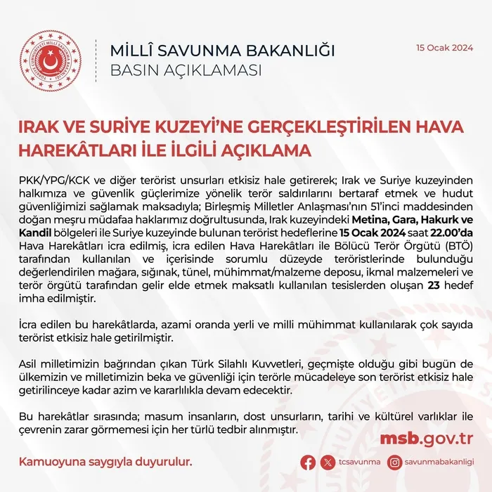 Bakanlıktan yapılan açıklamada, PKK/YPG/KCK ve diğer terörist unsurları etkisiz hale getirerek Irak ve Suriye kuzeyinden halka ve güvenlik güçlerine yönelik terör saldırılarını bertaraf etmek ve hudut güvenliğini sağlamak amacıyla Birleşmiş Milletler Anlaşması'nın 51. maddesinden doğan meşru müdafaa hakkı doğrultusunda, Irak'ın kuzeyindeki Metina, Gara, Hakurk ve Kandil bölgeleri ile Suriye'nin kuzeyinde bulunan terörist hedeflerine saat 22.00'de hava harekatları düzenlendiği belirtildi.