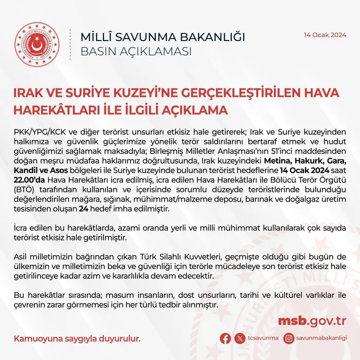MSB'den yapılan açıklamada, terör örgütü PKK/YPG/KCK ve diğer terörist unsurların etkisiz hale getirilerek Irak ve Suriye'nin kuzeyinden Türk halkına ve güvenlik güçlerine yönelik terör saldırılarını bertaraf etmek ve hudut güvenliğini sağlamak maksadıyla, Birleşmiş Milletler Anlaşmasının 51'inci maddesinden doğan meşru müdafaa hakları doğrultusunda, Irak'ın kuzeyindeki Metina, Hakurk, Gara, Kandil ve Asos bölgeleri ile Suriye'nin kuzeyinde bulunan terörist hedeflerine saat 22.00'de hava harekatlarının yapıldığı belirtildi.