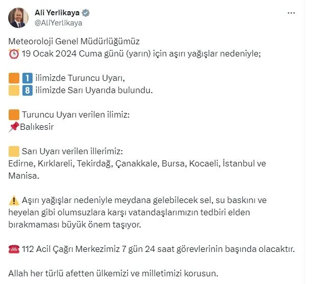 8 ilin sarı kodla 1 ilin turuncu kodla uyarıldığı haritayı paylaşan İçişleri Bakanı Ali Yerlikaya da sel ve su baskını hakkında söz konusu illeri uyardı.