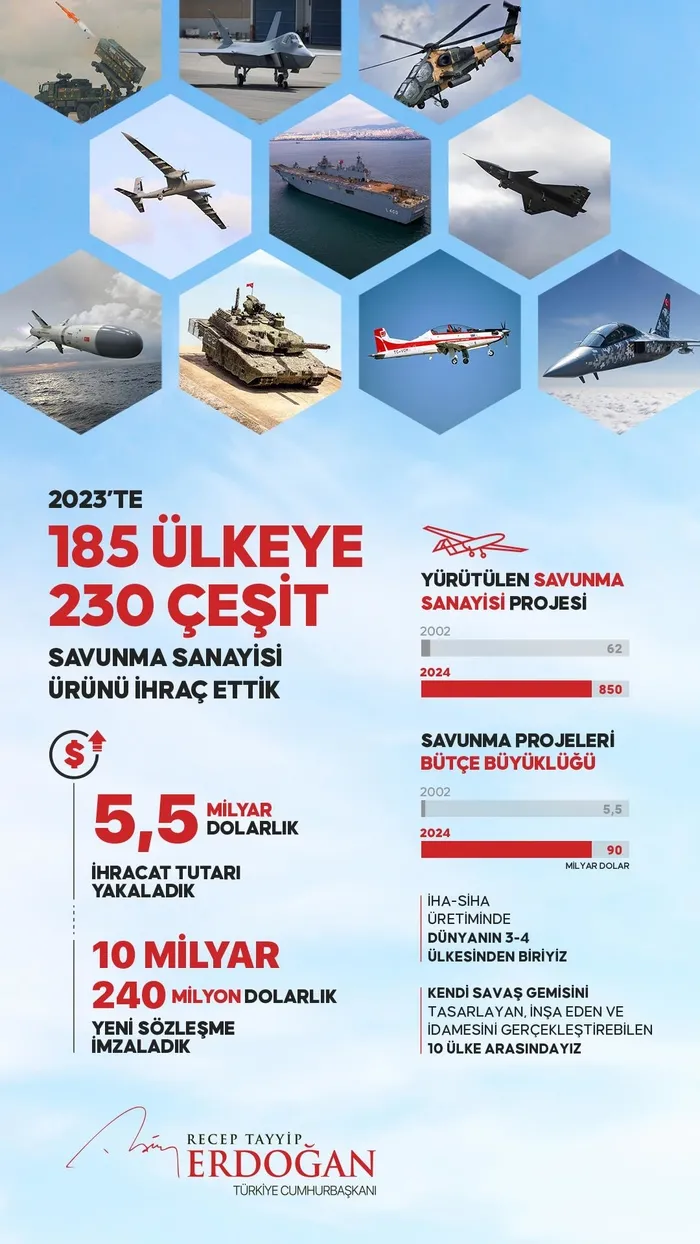 Erdoğan, 2023 yılında 185 ülkeye 230 çeşit savunma sanayi ürünü satarak toplamda 5,5 milyar dolarlık ihracat tutarını yakaladıklarını bildirdi.
