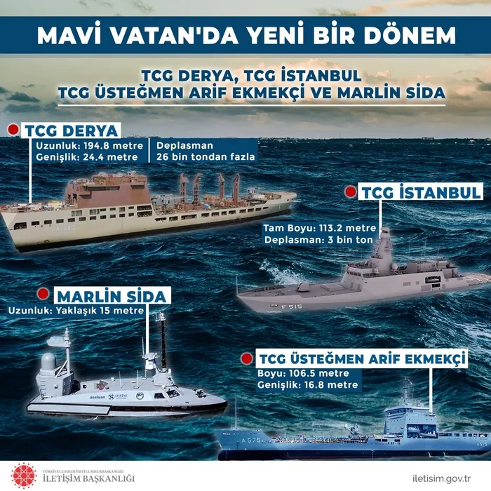 Paylaşımda, TCG Derya'nın uzunluğunun 194.8, genişliğinin 24.4 metre, deplasmanının da 26 bin tondan fazla TCG İstanbul'un boyunun 113.2 metre, deplasmanının 3 bin ton, TCG Üsteğmen Arif Emekçi'nin boyunun 106.5, genişliğinin 16.8 metre, Marlin SİDA'nın uzunluğunun ise yaklaşık 15 metre olduğu belirtildi.