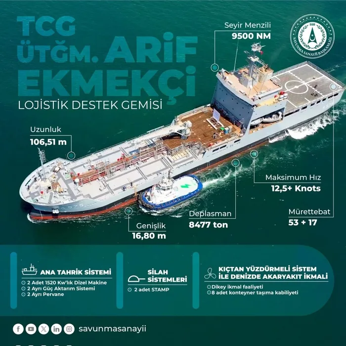106. metre uzunluğundaki lojistik destek gemisi olan TCG Üsteğmen Arif Ekmekçi'nin genişliği 16.8 metre olarak kayıtlara geçti.