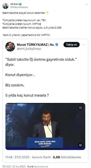 Bugün ise yaptığı paylaşımda 5 yılda toplamda 9 bin konut yapabildiğini itiraf etmiş oldu. 1000 bin konut sözünü unuttu ve kentsel dönüşümü hızlandırdık diye yalan söylerken yüzü bile kızarmadı. İstanbul depremini ön tedbirler alması, bunu bir siyaset üstü mesele olarak görmesi gerektiği söylenmesine rağmen icraat değil laf üretti."