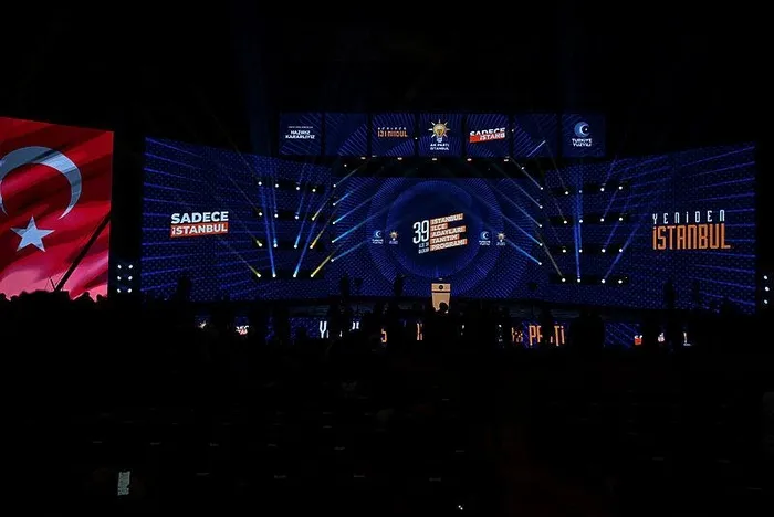 "Türkiye Yüzyılı Şehirleri İçin Hazırız Kararlıyız", "Sadece İstanbul", "Yeniden İstanbul" yazıları ile AK Parti ve Türkiye Yüzyılı logoları, sahnedeki led ekranlarda gösterildi.