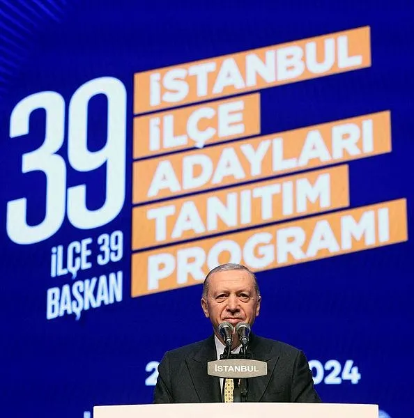 Başkan ve AK Parti Genel Başkanı Recep Tayyip Erdoğan, 31 Mart 2024 yerel seçimleri öncesi Haliç Kongre Merkezi'nde düzenlenen aday tanıtım toplantısında İstanbul'daki 39 ilçenin belediye başkan adayını açıkladı.