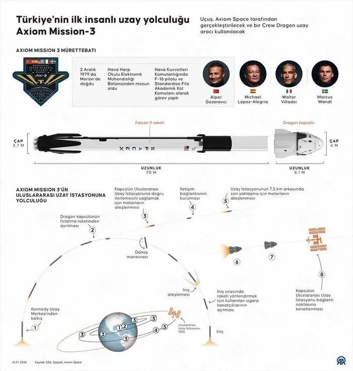 İlk Türk astronot Alper Gezeravcı'yı taşıyan Dragon kapsülü, 4 mürettebatı Uluslararası Uzay İstasyonu'na ulaştırmak üzere ilerliyor. Dragon kapsülünün TSİ 12.27'de uzay istasyonuna kenetlenmesi bekleniyor. Ekip, uzay istasyonundaki 7 astronot tarafından karşılanacak.