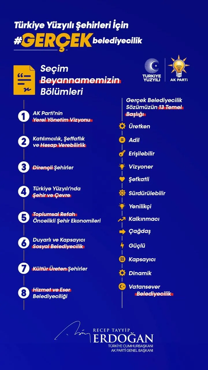 Başkan Recep Tayyip Erdoğan AK Parti Genel Merkezi yeni konferans salonunda AK Parti'nin seçim beyannamesini açıkladı. 8 başlıktan oluşan beyannamenin ana temasını "Gerçek belediyecilik" olarak vurgulayan Başkan Erdoğan CHP'nin belediyecilik anlayışını eleştirerek "Engellendik yalanlarına kanmayın" dedi. Erdoğan, "Mevcut sorunların çözüm adresi yine biziz, AK Parti. Cumhur İttifakı dışındaki partilerin ve siyasetçilerin böyle gündemleri zaten yok. " ifadelerini kullandı.