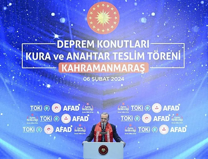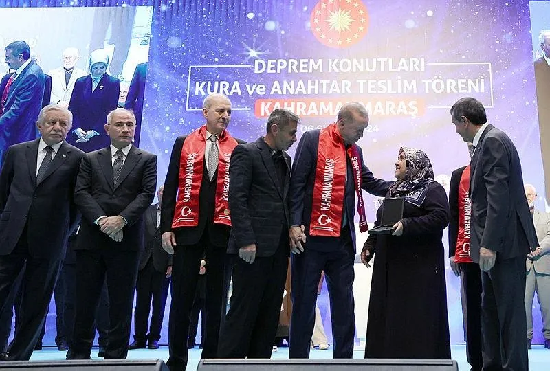 Cumhurbaşkanı Recep Tayyip Erdoğan, Kahramanmaraş Sütçü İmam Üniversitesi Yunus Emre Kongre Merkezi'nde ʺDeprem Konutları Kura ve Anahtar Teslim Töreniʺne katıldı.