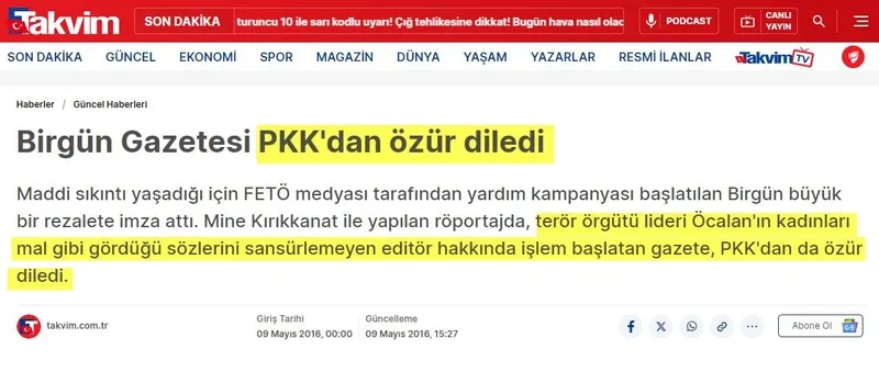 Birgün 2016 yılında PKK'dan açık açık özür dilemiş, bir röportajda Öcalan'ın kadınları mal gibi gördüğüne dair sözleri sansürlemeyen edtör hakkında işlem başlatmıştı.