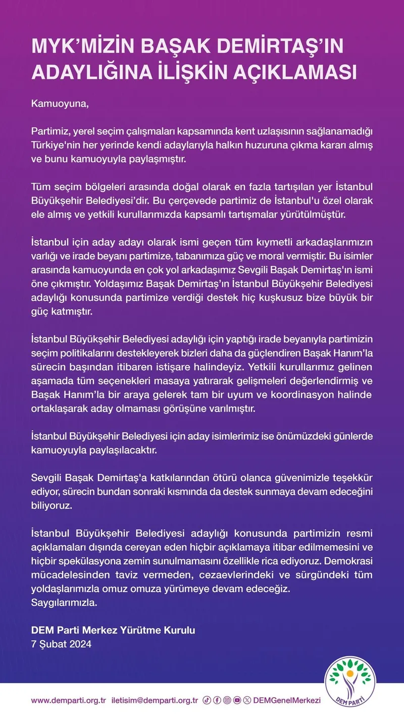 DEM Parti'den ise "Yetkili kurullarımız gelinen aşamada tüm seçenekleri masaya yatırarak gelişmeleri değerlendirmiş ve Başak Hanım'la bir araya gelerek tam bir uyum ve koordinasyon halinde ortaklaşarak aday olmaması görüşüne varılmıştır" açıklaması geldi.