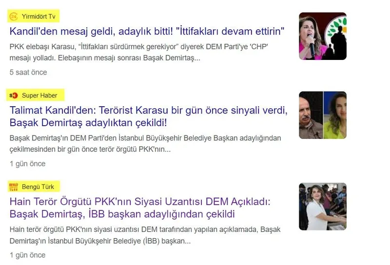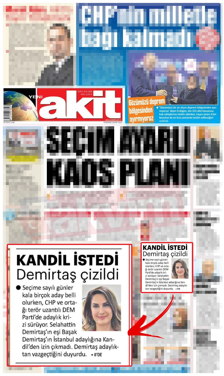 TAKVİM'in PKK elebaşı Mustafa Karasu'nun Kandil'den verdiği talimatla eş güdümlü olarak Başak Demirtaş'ın adaylıktan çekilmesinin perde arkasını anlattığı haber gündeme yön verdi. Dijital medya platformları, TV ve gazeteler Takvim'in haberini kaynak aldı, Demirtaş'ın adaylıktan çekilmesindeki PKK parmağını ve CHP - DEM - Kandil hattında süregelen pazarlıkları haberleştirdi. İşte TAKVİM'in çizdiği perspektif üzere yapılan o haberler...