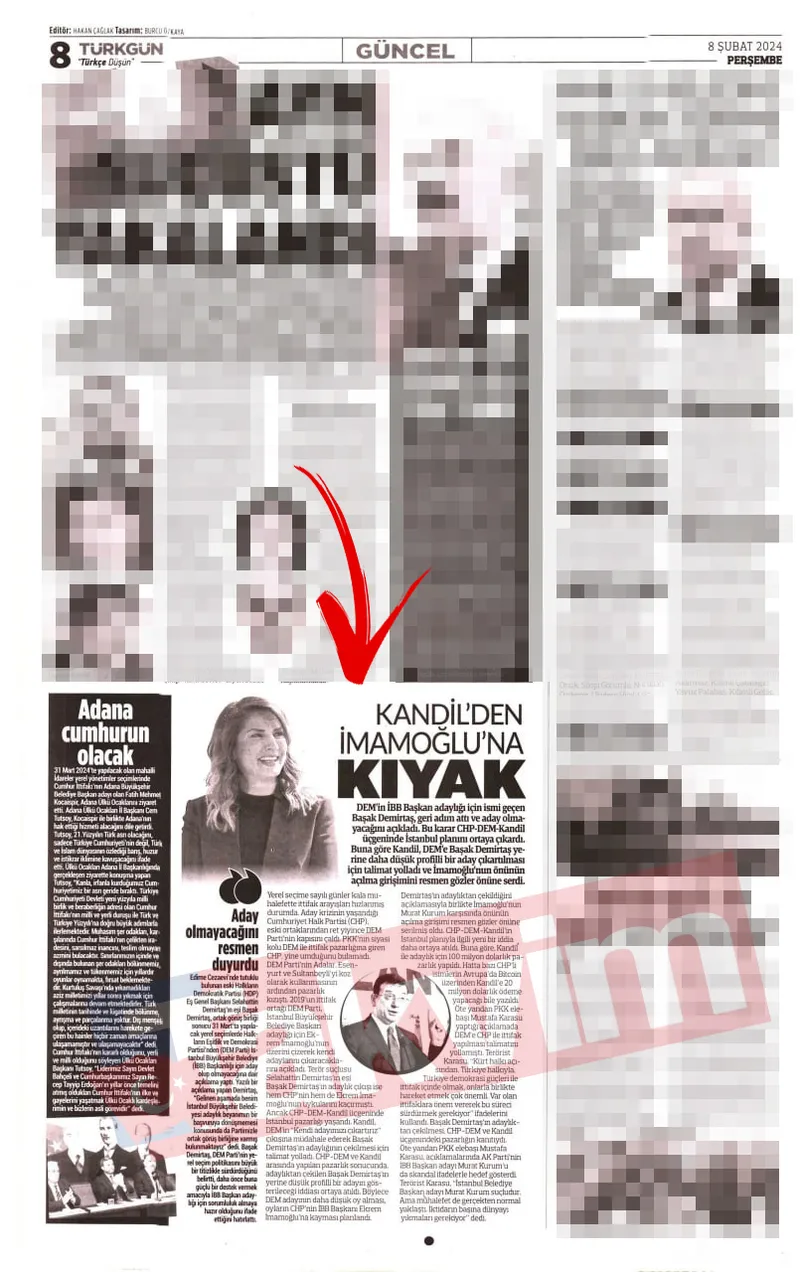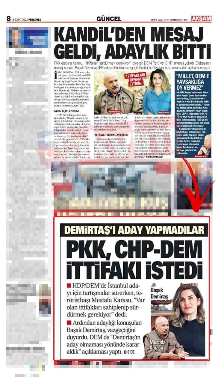 Türkiye, Başak Demirtaş'ın adaylıktan çekilme sürecinin perde arkasını ilk olarak Takvim'den okudu. PKK elebaşı Mustafa Karasu'nun DEM'e gönderdiği "Pazarlığı sıkı tutun, ittifakı güçlendirin" çağrısı sonrası Demirtaş adaylıktan çekildi.