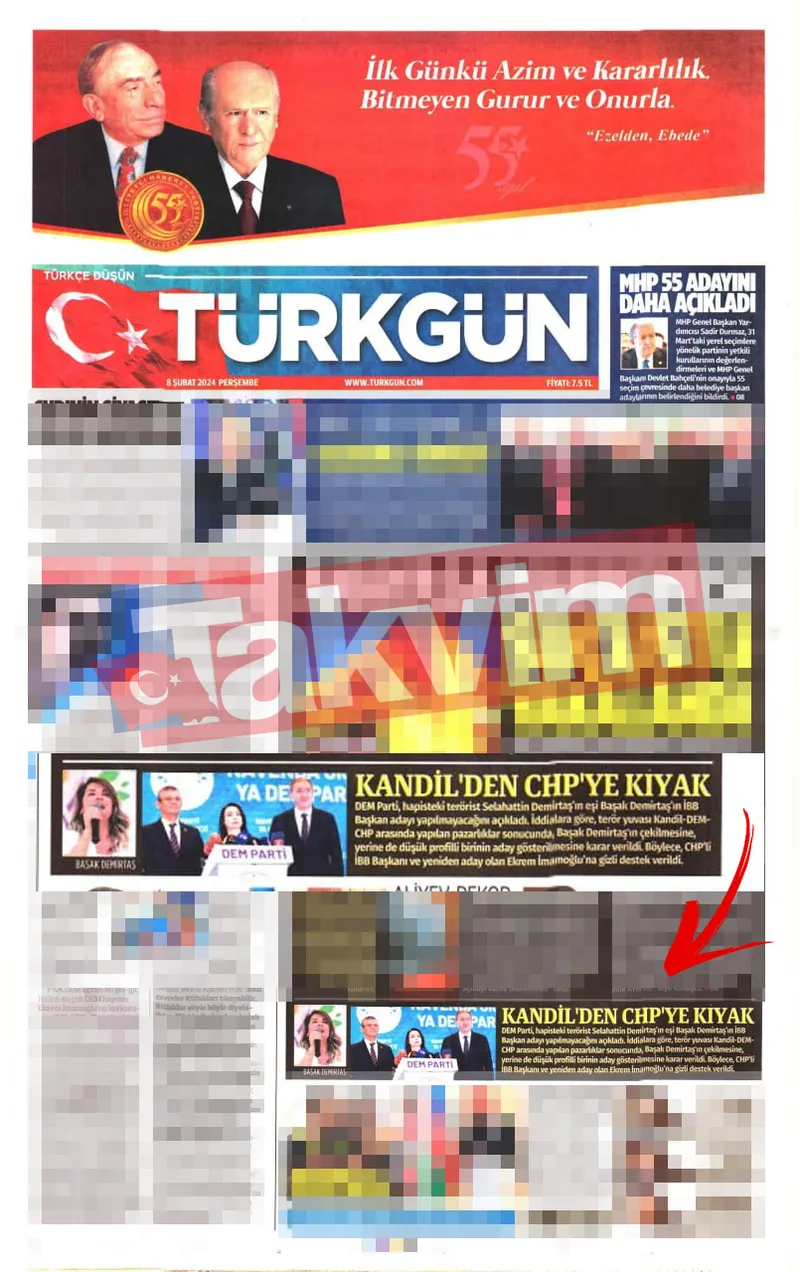 TÜRKGÜN Gazetesi, TAKVİM'in çizdiği perspektif üzerine durumu haberleştirdi. "KANDİL'DEN CHP'YE KIYAK" başlığı kullanıldı.
