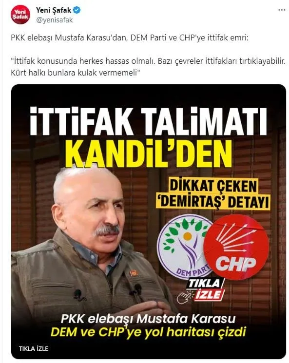 Kandil'deki ininden açıklama yapan Karasu, DEM'e CHP'li yol haritası çizdi. İş birliğini 'çok önemli' olarak niteleyip "Pazarlığı sıkı tutun, ittifakı güçlendirin" mesajı gönderdi.