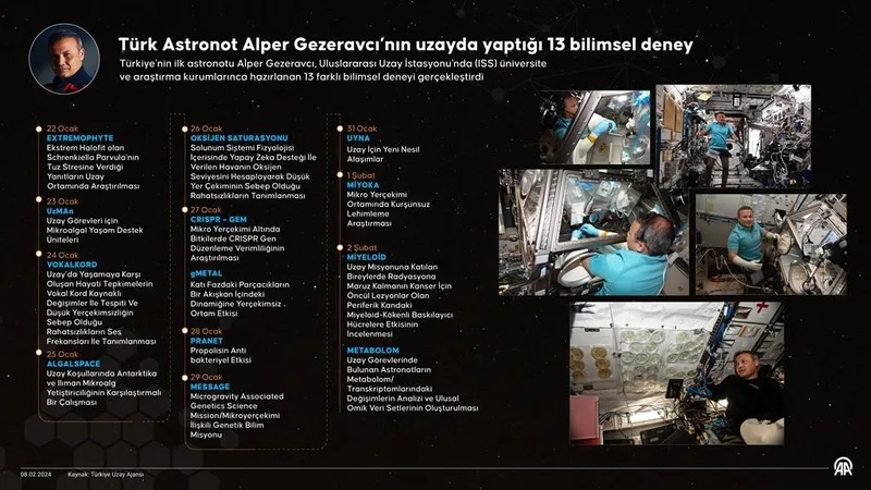 Türkiye'nin ilk astronotu Alper Gezeravcı, uzay koşullarının insan sağlığı üzerindeki etkilerini ortaya çıkarmayı amaçlayan "METABOLOM" isimli deneyiyle Uluslararası Uzay İstasyonu'ndaki (ISS) son bilimsel çalışmasını gerçekleştirdi.