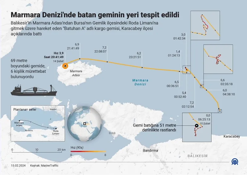 Balıkesir'in Marmara Adası'ndan 14 Şubat Çarşamba günü saat 20.30'da Bursa'nın Gemlik ilçesindeki Roda Limanı'na gitmek üzere 1250 ton mermer tozu yüküyle hareket eden "Batuhan A" adlı kargo gemisi, kötü hava ve deniz şartları nedeniyle dün saat 06.20'de Karacabey ilçesi açıklarında batmıştı. "Batuhan A"nın 6 kişilik mürettebatı için çok sayıda kurum ve kuruluş tarafından yürütülen arama kurtarma çalışmalarında, geminin battığı bölgede boş can salı bulunmuştu.