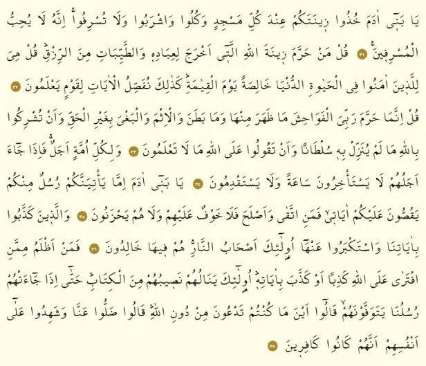 31.Ya benı ademe huzu zıneteküm ınde külli mescidiv ve külu veşrabu ve la tüsrifu innehu la yühıbbül müsrifın
