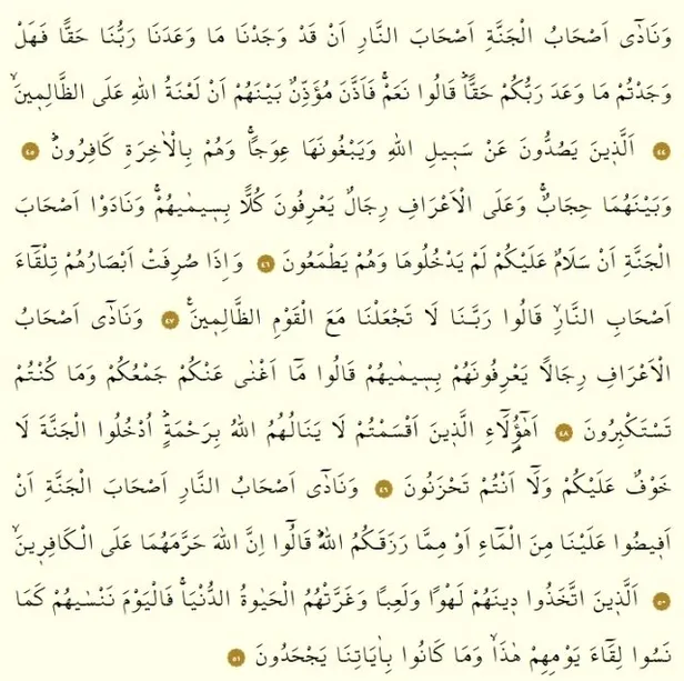 44.Ve nada ashabül cenneti ashaben nari en kad vecedna ma veadena rabbüna hakkan fe hel vecedtüm ma veade rabbüküm hakka kalu neam fe ezzene müezzinüm beynehüm el la'netüllahi alez zalimın