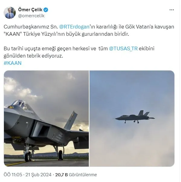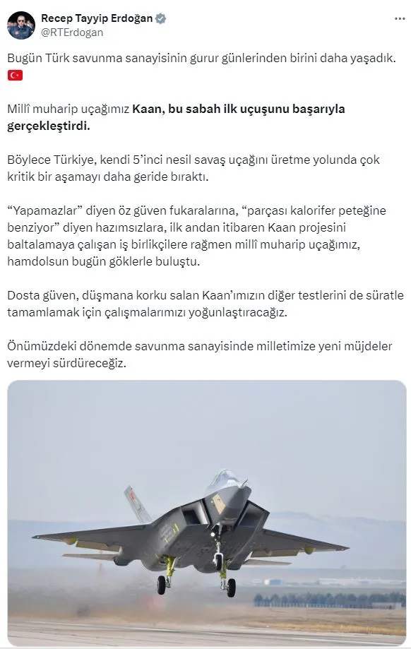 "Bugün Türk savunma sanayisinin gurur günlerinden birini daha yaşadık. Millî muharip uçağımız Kaan, bu sabah ilk uçuşunu başarıyla gerçekleştirdi. Böylece Türkiye, kendi 5'inci nesil savaş uçağını üretme yolunda çok kritik bir aşamayı daha geride bıraktı.