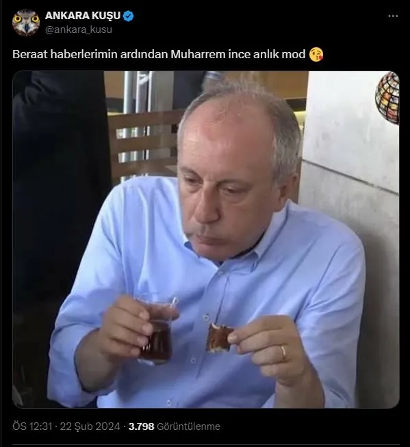Kararın ardından "Ankara Kuşu" hesabı sosyal medya hesabından paylaşım yaptı. İnce'nin bir fotoğrafını paylaşarak alay eden hesap, "Beraat haberlerimin ardından Muharrem ince anlık mod" ifadelerini kullanarak adeta kutlama yaptı.