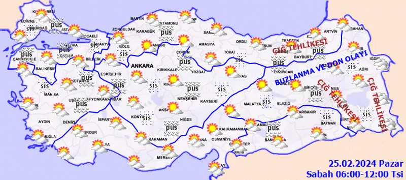 Meteoroloji Genel Müdürlüğü olarak yapılan son değerlendirmelere göre; Doğu Anadolu'nun doğusu ile Marmara'nın batısı, Kıyı Ege ve Batı Akdeniz kıyılarının parçalı yer yer çok bulutlu, diğer yerlerin az bulutlu ve açık geçeceği tahmin ediliyor. Sabah ve gece saatlerinde Marmara ile iç ve doğu kesimlerde yer yer pus ve sis ile birlikte doğu bölgelerde yer yer buzlanma ve don olayı bekleniyor. Doğu Karadeniz'in iç kesimleri ile Doğu Anadolu'nun kuzey ve doğusunda çığ tehlikesi bulunmaktadır.